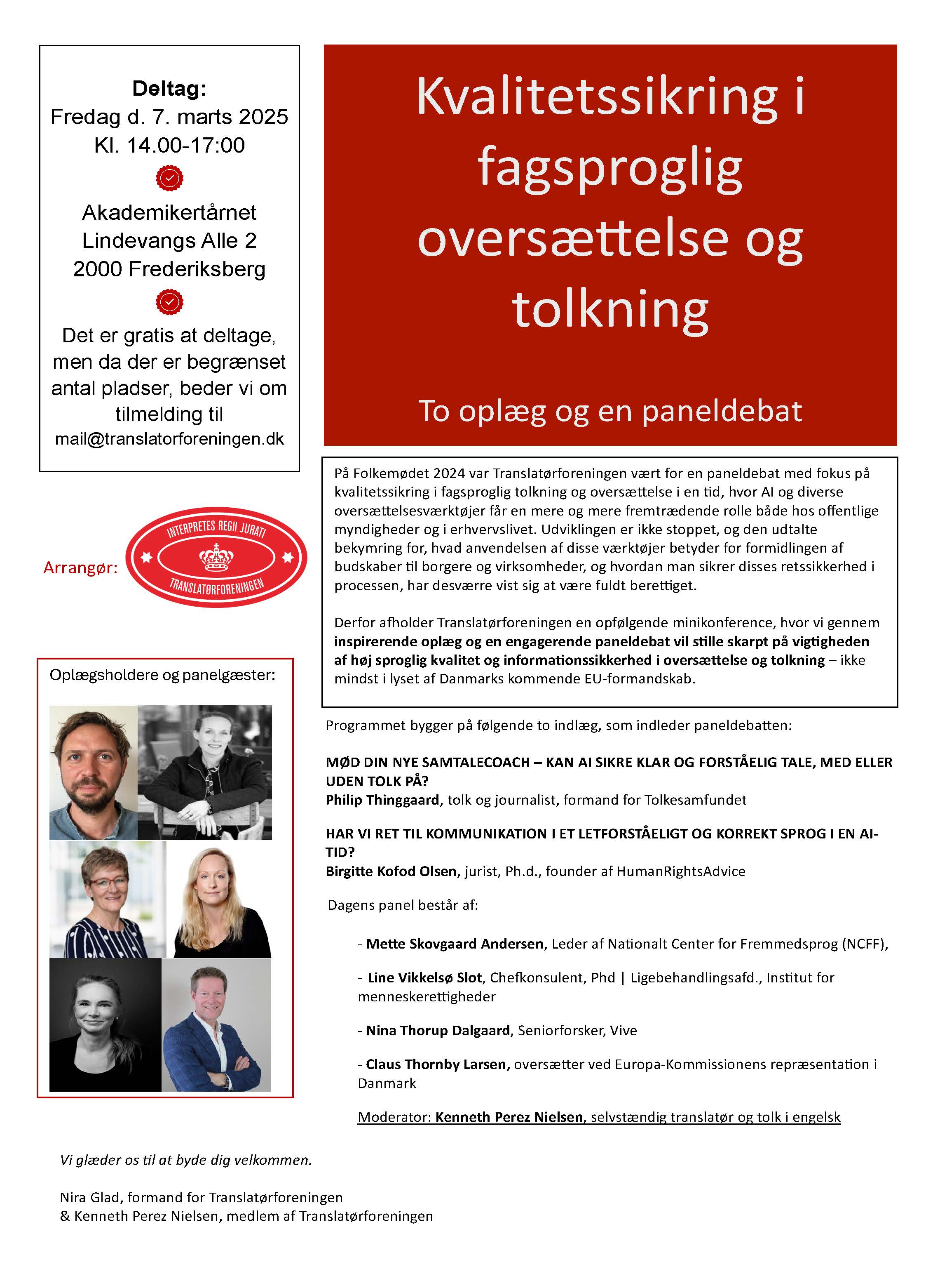 Det er gratis at deltage, men da der er begrænset pladser, beder vi om tilmelding til mail@translatorforeningen.dk